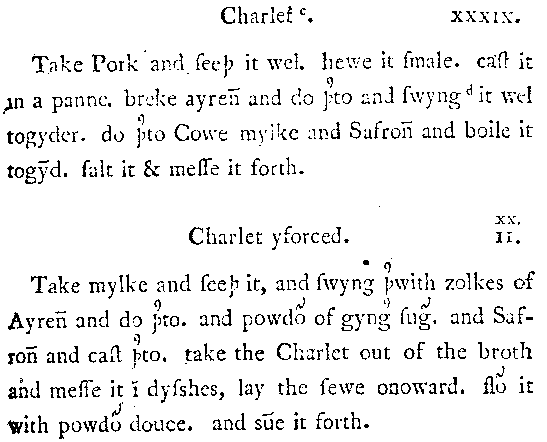 The second recipe, "charlet yforced", gives some ideas for variations. In particular, a sauce of milk thickened with egg yolk and flavoured with spices, especially ginger.